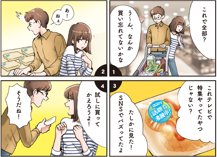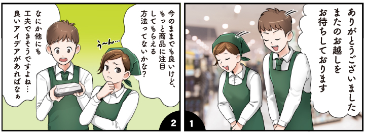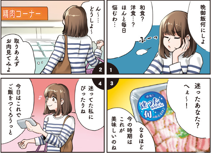 お客様、特に主婦の方は毎日の献立に頭を悩ませています。今日は、明日は何にしようか、どれにしようかと…。そんなお客様の悩み、迷いに共感していること、お客様の身になっていることが伝われば、手にとっていただける確率は確実に上がります。