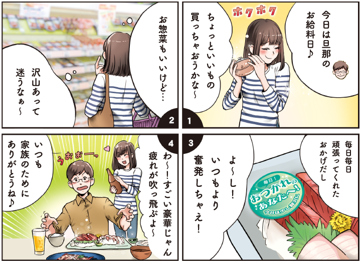 お給料日、お給料日後は主婦の方にとっていつもより奮発しやすい傾向にあります。そんな時に共感するラベルで更に後押し!単身で働く方にも自分へのご褒美として手にしていただけるのに有効です!