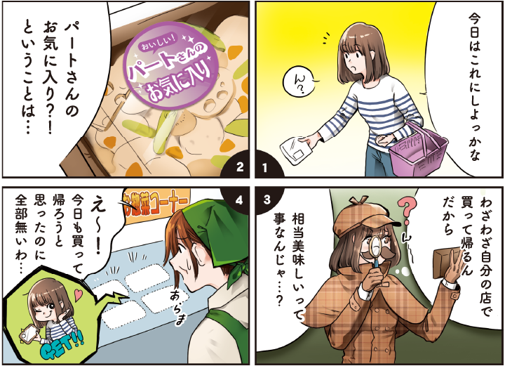 パートさんが買って帰る。つまりお店の身内、パートさんは舌が肥えているという発想から「この商品は美味しいに違いない」という発想に転換されます。美味しいという根拠が生まれ、購買意欲がグンッと UPします。