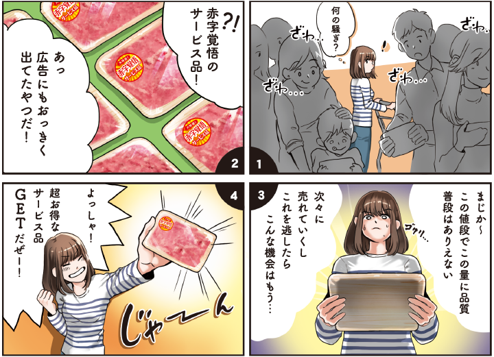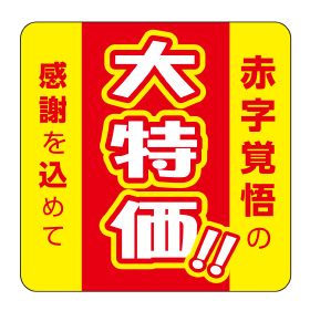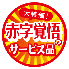 「赤字覚悟」という言葉を使用することによって、お店が損=儲け度外視=買うとお得といった心理状況を生み出します。より良いものを少しでも安く…!お客様に還元する意味も含んでいます。